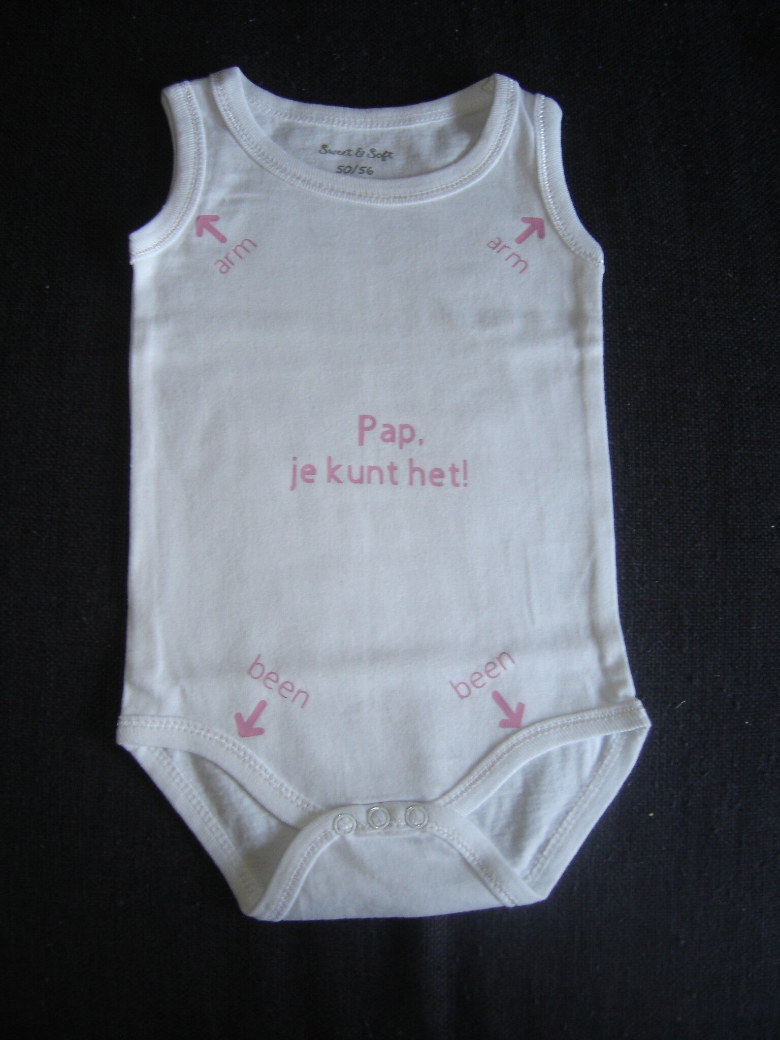 Bij bestelling graag tekstkleur, en evt. gewenste maat en/of kleur romper vermelden. Beschikbare rompers (kleuren en maten) kunt u vinden in de tabel op de pagina ´eigen tekst op glas, hout, textiel of plastic´.